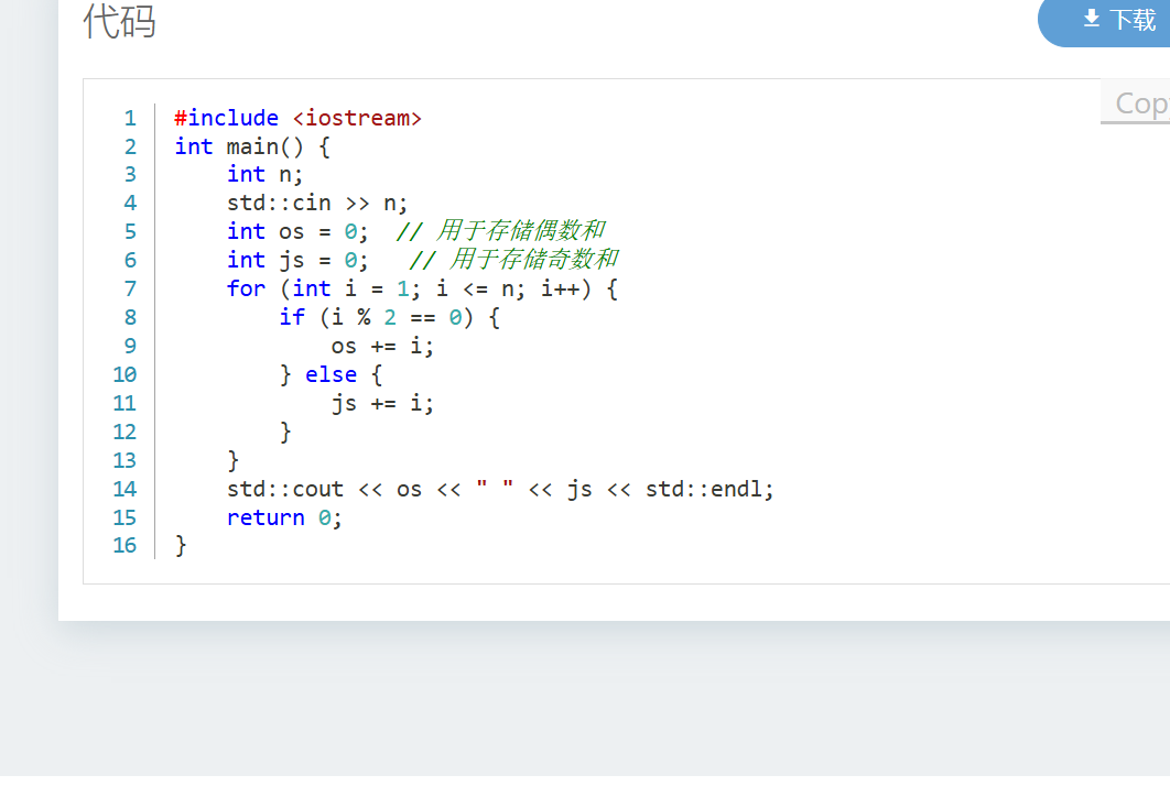 示例:伪代码转C++// 伪代码 function sum(n integer) integer s ← 0 for i ← 1 to n do s ← s + i end for return s end function // C++代码 int sum(int n) { int s = 0; for (int i = 1; i <= n; i++) { s += i; } return s; }七、练习:用伪代码描述算法